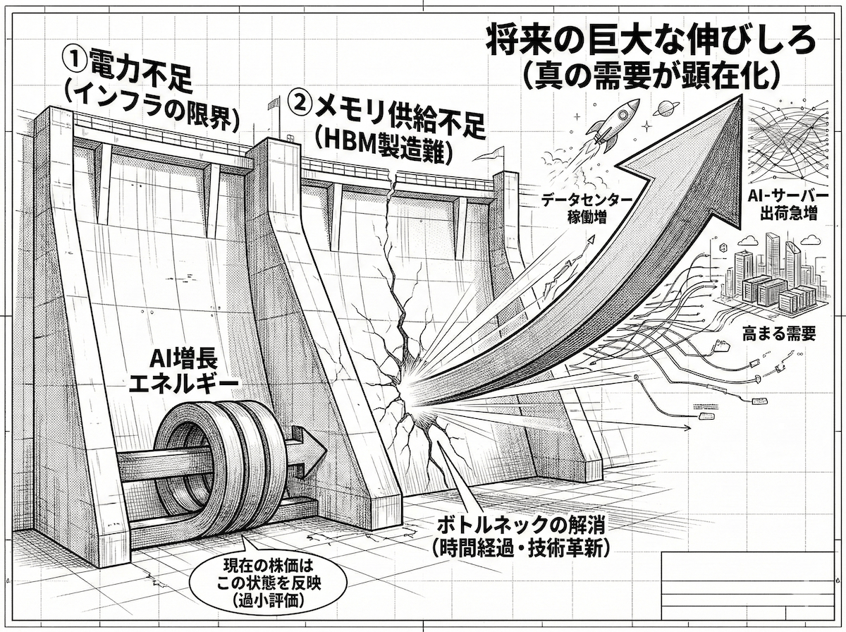 なぜ私が『AI相場はまだまだこれから』と何度も言っているのか。それは、AIの真の実力が今のところ物理的なボトルネックによって押さえつけられている状態だからです。