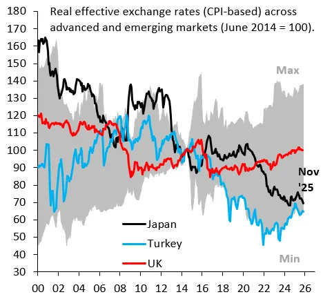 😊かつての日本円(約20年前):指数は160ポイント前後。世界中のモノを安く買える『強い通貨』。